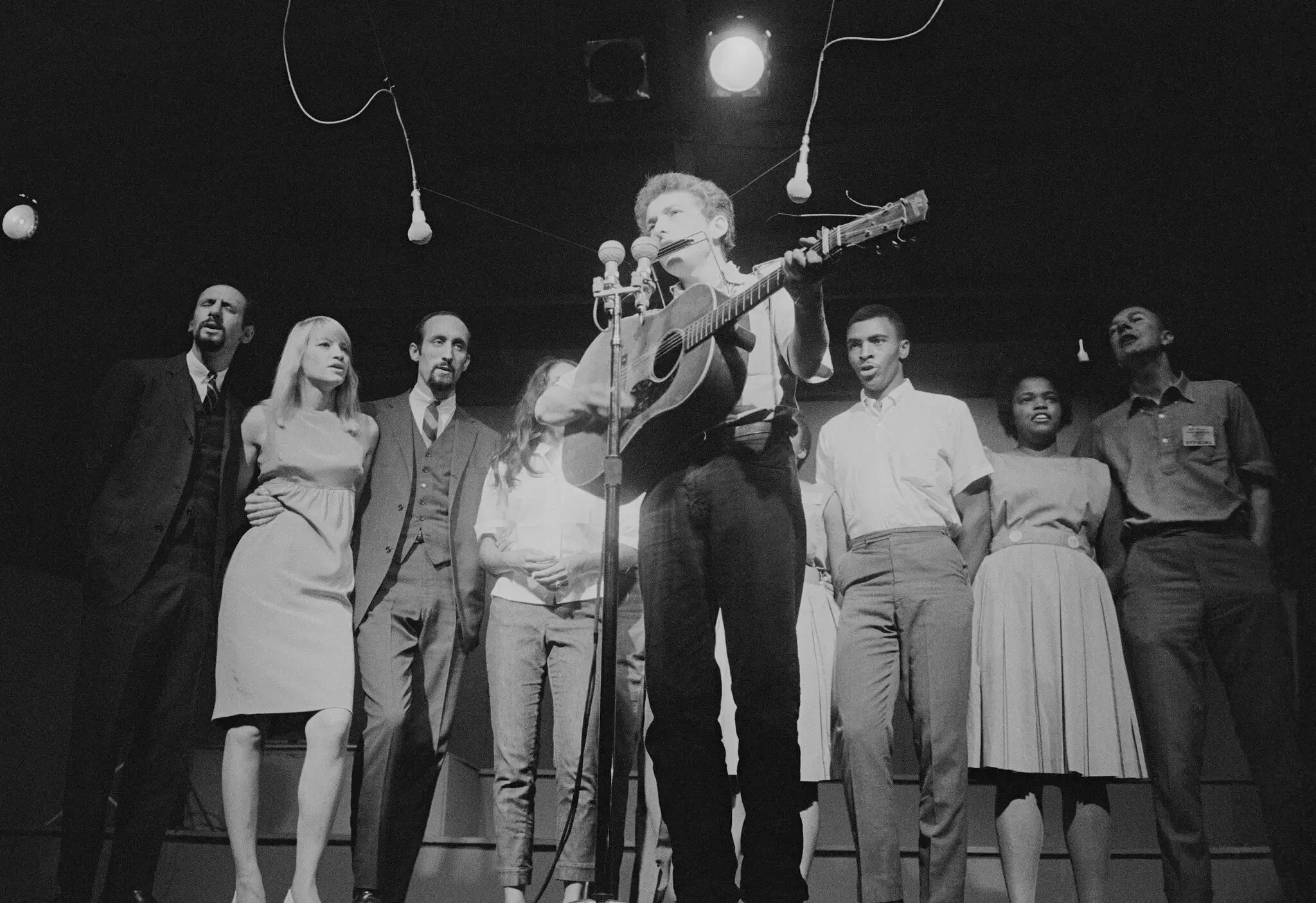 Dylan was still acoustic at the 1963 Newport Folk Festival, where he was backed by, among others, Peter Yarrow, left, Mary Travers, Paul Stookey, Joan Baez, Charles Neblett, Rutha Mae Harris and Pete Seeger. Credit © Rowland Scherman/Getty Images